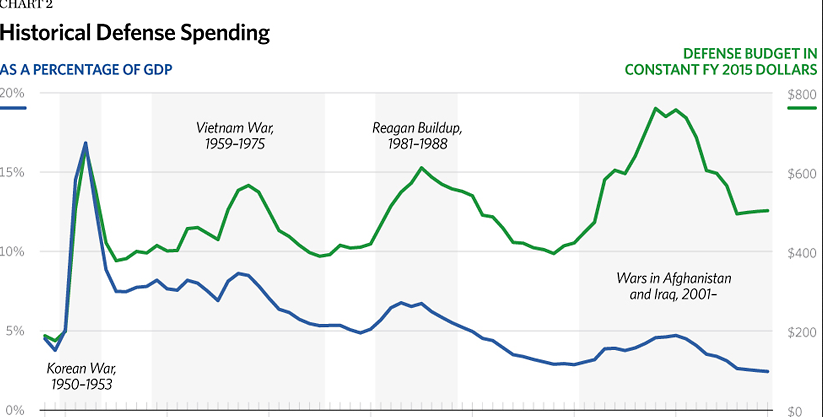For a closer look at defense spending through the years, The Daily Signal offers this chart from 1948 into the future.