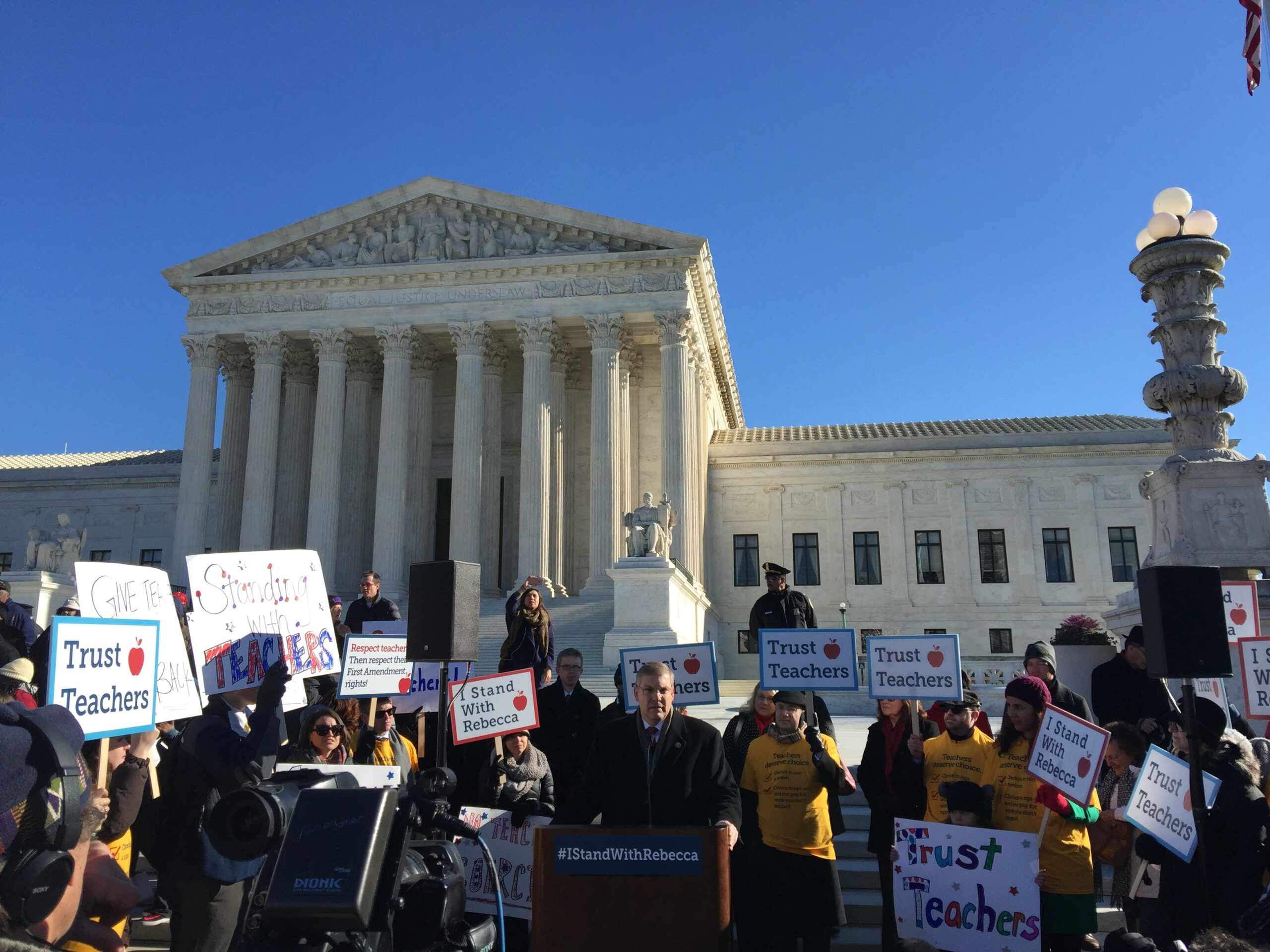 After 80 minutes of arguments before the justices, Friedrichs emerged from the court to chants of “stand with Rebecca” from the crowd who had gathered to stand in solidarity with the California teacher.