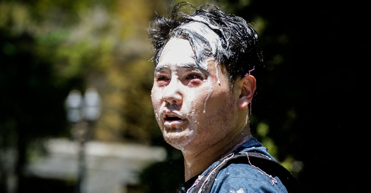 Then the mob started throwing milkshakes, other liquids, eggs, and other hard objects at my face [and] my head. That literally blinded me for the moment.