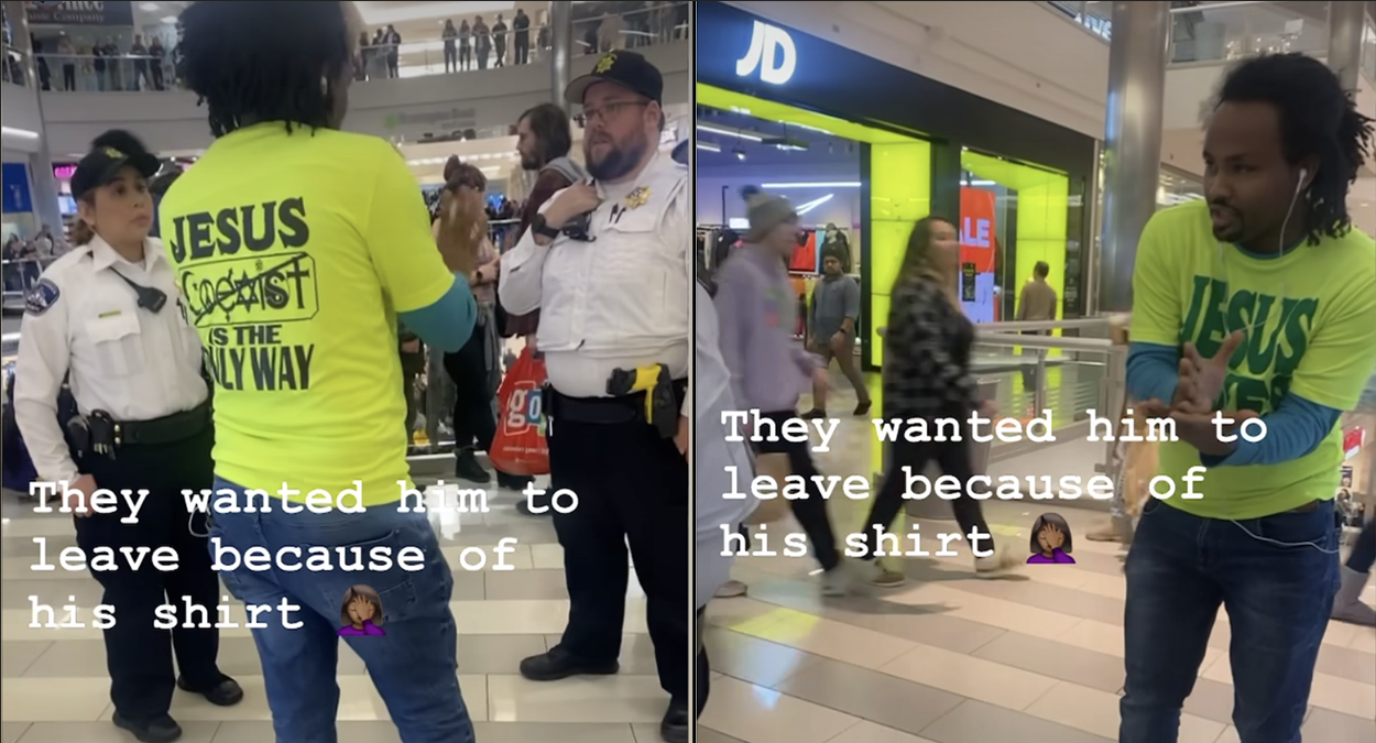 Mall security guards at the Mall of America in Bloomington, Minnesota, ordered a man to remove his “Jesus Saves” T-shirt or leave the mall, footage shows.