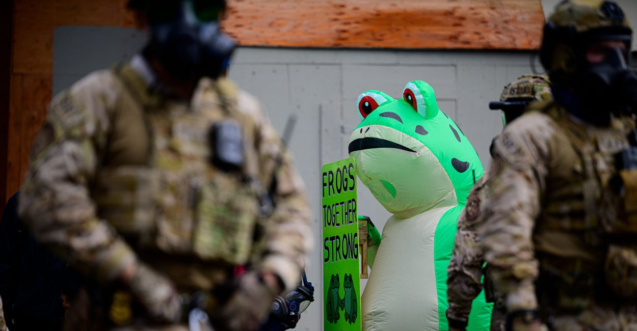 Inside the paper, under colorful pictures of cutesy anti-fascists, the headline was “In Inflatable Animal Costumes, Protesters Are Keeping Portland Weird.” Online, the headline was also playful: “Among Portland Protests, It’s Frogs and Sharks and Bears, Oh My!”